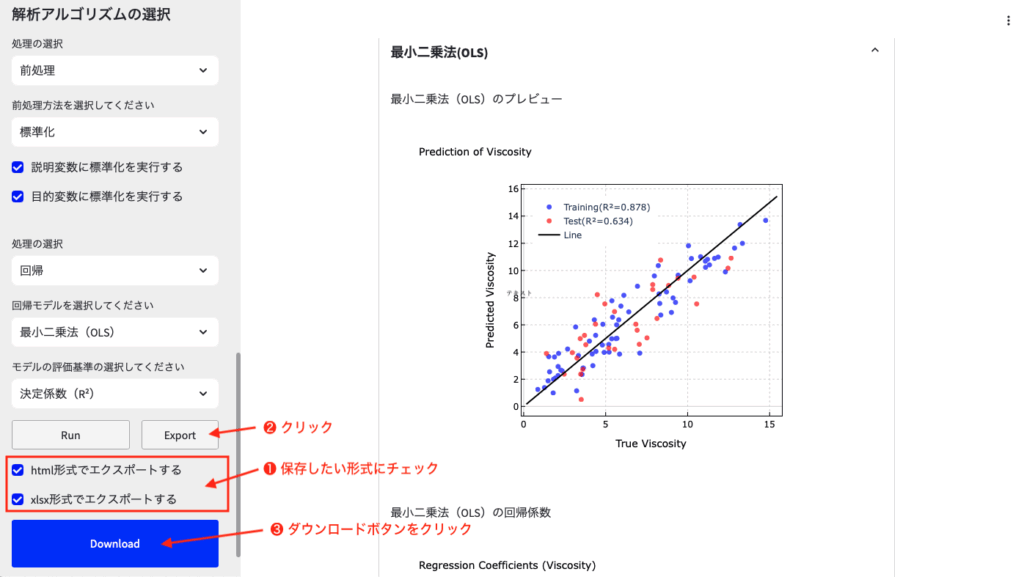 回帰モデルを作成した後,❶保存したい形式にチェック,❷Exportをクリック,❸Downloadボタンをクリックすることで,保存できます。
