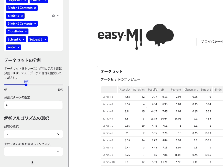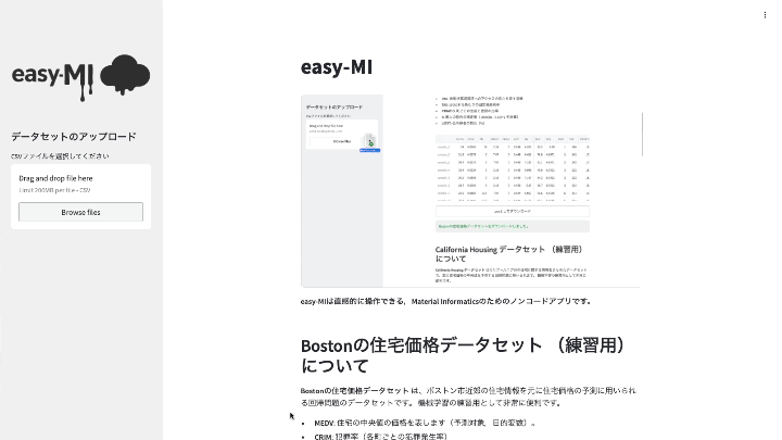説明書いらずで,直感的に触って動かせるユーサビリティを実現しています。ぜひ,easy-MIを触りながら機械学習を体験してください。Webバージョンは完全無料でお使いいただけます。
